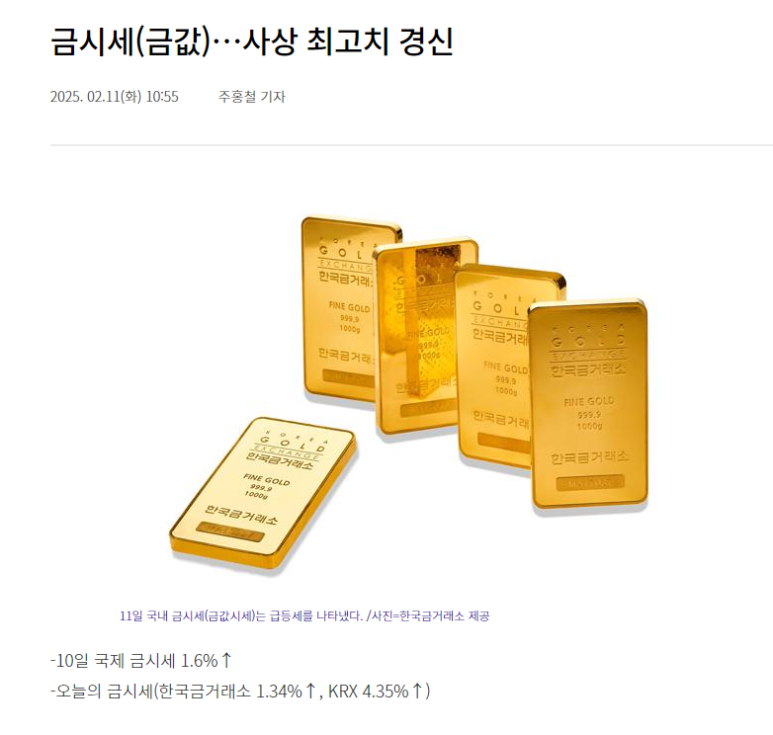 - KRX(한국거래소) 금시세: g당 159,870원(+4.35%), 사상 최고치 근접.