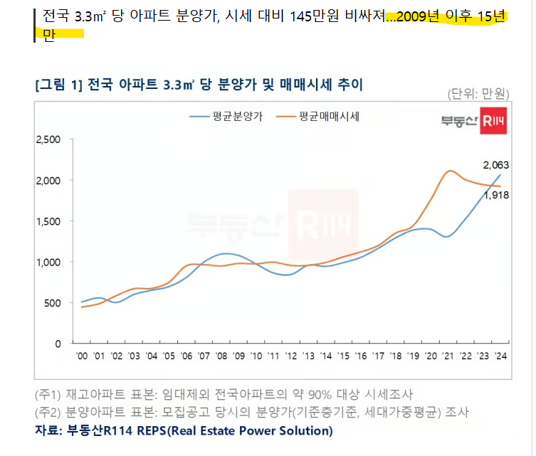 부동산R114 자료에 따르면 2024년 서울 아파트 3.3㎡당 평균 분양가가 약 4,820만 원, 반면 기축 아파트 평균 매매가는 4,300만 원 수준으로 파악되었습니다.