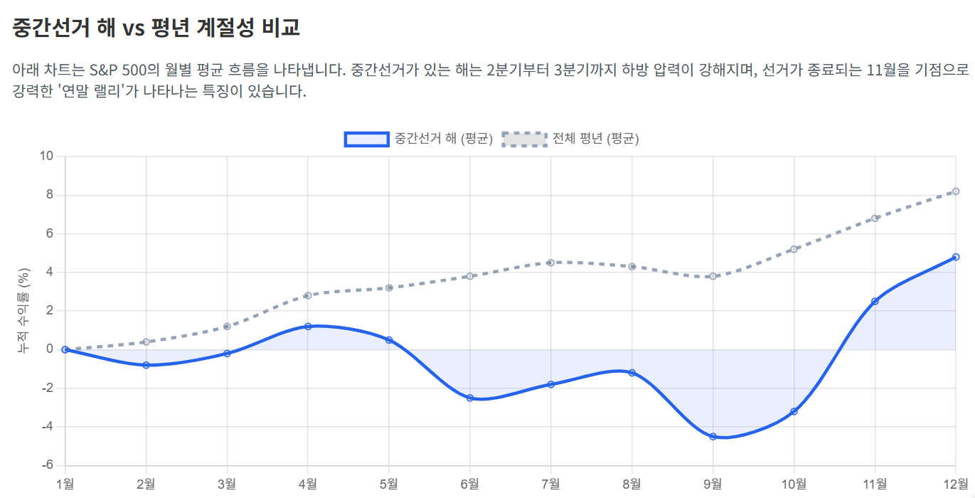미국 중간선거 주기와 증시 수익률 상관관계 분석미국 증시에는 4년 주기의 대통령 선거 사이클이 존재합니다. 그 중에서도 임기 2년차에 해당하는 중간선거(Midterm Election)는 역사적으로 증시 변동성이 가장 확대되는 시기로 알려져 있습니다. 과거 데이터를 통해 중간선거가 시장에 미친 실질적인 영향력을 분석해 보겠습니다.중간선거 해 vs 평년 계절성 비교아래 차트는 S&P 500의 월별 평균 흐름을 나타냅니다. 중간선거가 있는 해는 2분기부터 3분기까지 하방 압력이 강해지며, 선거가 종료되는 11월을 기점으로 강력한 '연말 랠리'가 나타나는 특징이 있습니다.의회 구성 변화에 따른 증시 반응시장 참여자들은 흔히 특정 정당의 승리를 기대하지만, 통계적으로 증시는 '교착 상태(Gridlock)'를 선호..